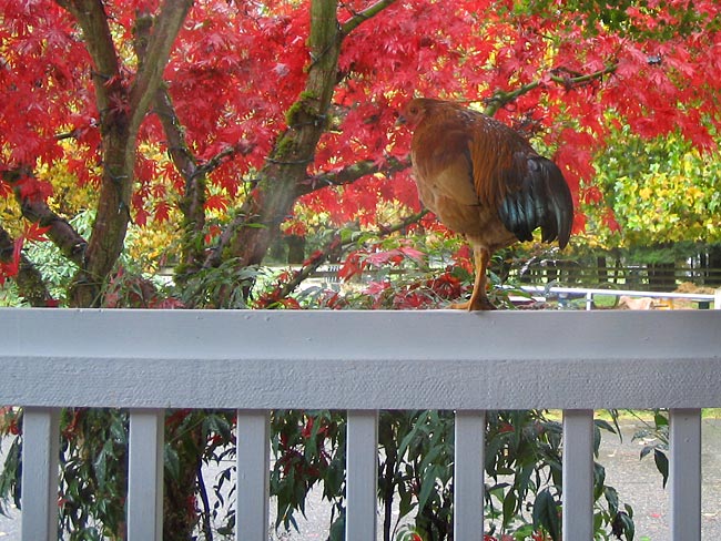 The day-old chick my neighbors found orphaned in the road has outgrown the heat lamp in the bathroom and has revealed himself to be a rooster, now mostly called Chicky Boy. He is a bantam (miniature) rooster with feathered legs but no specific breed that I know of. Chicky grew into a beaut of a rooster, though not nearly as big as the resident Chico who laughs and calls him names and never lets Chicky join in any chicken games. So it was time for Chicky Boy to find a home and some hens of his own, which he did, and he is now living the good life on another farm where he is known as Brutis.