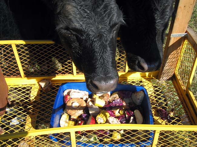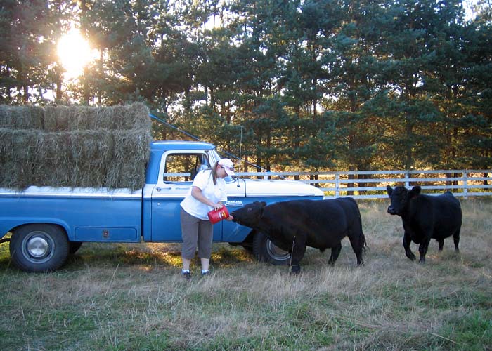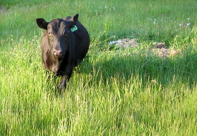 True to breed, the meat steers marble exceptionally, producing rich, flavorful, high-choice beef. While here, steers live the best cattle-life possible, free-ranging on never-sprayed pastures with a bit of supplemental grain, high quality bread, fruits, vegetables, and the occasional loaf of Cinnamon Swirl bread. The amount of grain they recieve is minimal, and not enough to change their digestive process to that of grainfed — while not purely grassfed, they are close, though that bit of supplemental feed rounds out their marbeling and produces a mellower beef flavor preferred by most consumers. Resident steers are unfailingly treated with kindness and respect, and processed as humanely as possible.